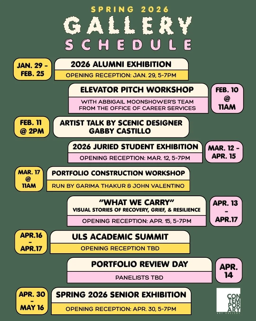 SLU CONTEMPORARY ART GALLERY SLU CONTEMPORARY ART GALLERY SLU CONTEMPORARY ART GALLERY MARK YOUR CALENDARS! MARK YOUR CALENDARS! MARK YOUR CALENDARS! CURRENT EXHIBITION 2026 ALUMNI EXHIBITION JANUARY 29-FEBRUARY 25,2026 more info
